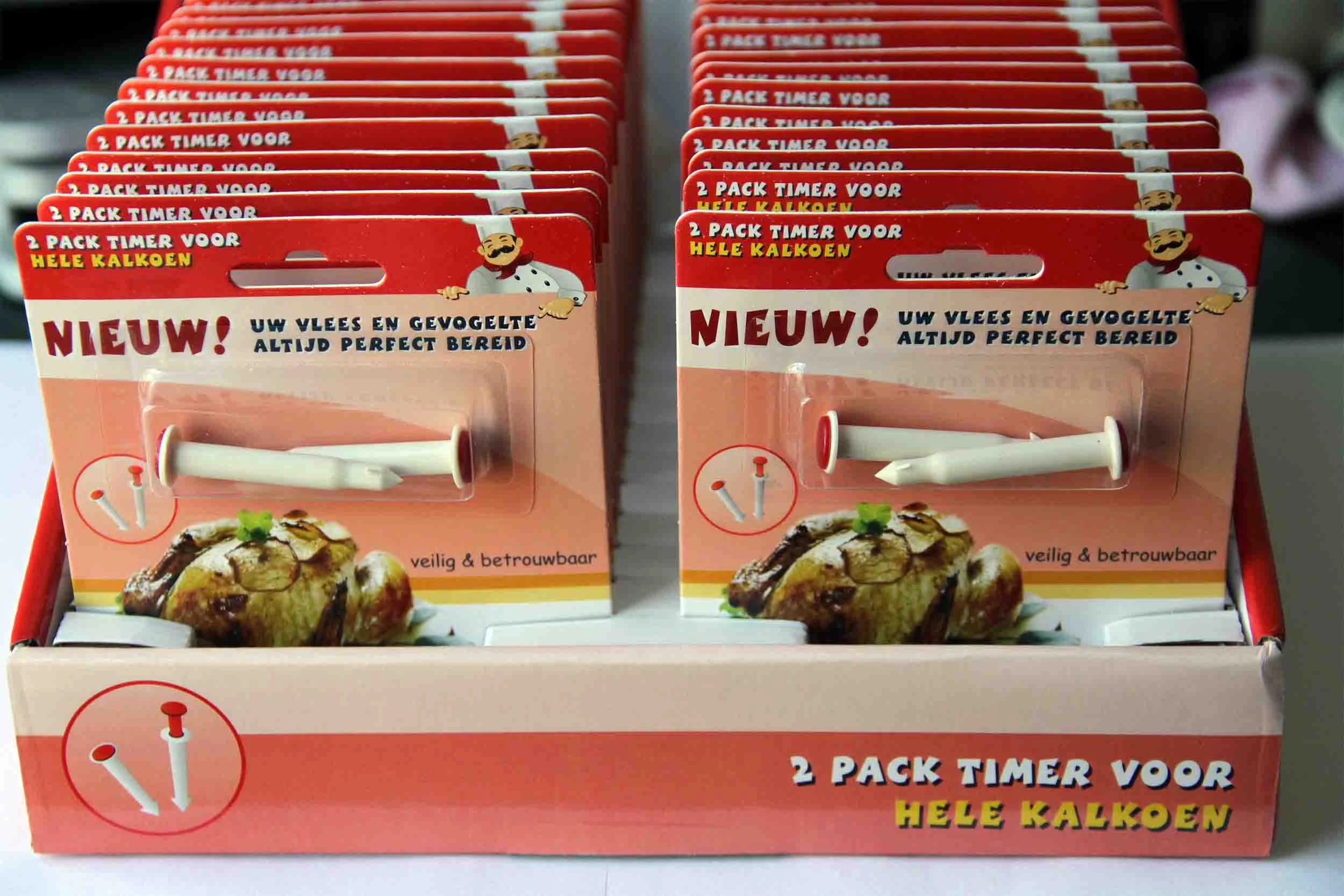 The Bonpack Timer is a precise judge when poultry, meat or fish is done. It eliminates guesswork by sensing the internal temperature of the product. The Bonpack Timer ensures a perfectly cooked meal each and every time. Each Bonpack Timer is set to activate at a precise temperature ranging from 52 to 82 °C. There are variety of models designed for specific types, cuts, and weights of meat.